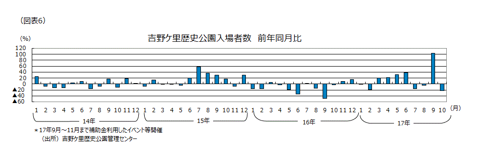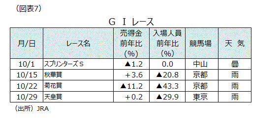 10月分の各観光地の人出の前年同月比はかなり悪いところが多いようだ。吉野ヶ里歴史公園では9月の入場者が前年比103.5%増と佐賀県の補助金を活用した「子育てしたい券」が始まるなどの工夫で家族連れ客が増えて倍増となっていたが、10月分の前年同月比は天候により▲21.6%となってしまった。金沢兼六園の入園者10月分は前年同月比▲12.3%、函館五稜郭タワーの利用者も10月分は前年同月比▲15.9%と2ケタ減少になってしまった(図表6)。JRA(中央競馬会)の秋GIレースも秋華賞から天皇賞にかけての3レースが雨になり、入場人員はいずれも前年比2ケタの減少になってしまった。但し、そうした中でも売得金はプラスを推移したレースがあり、底堅さも感じさせる(図表7)。