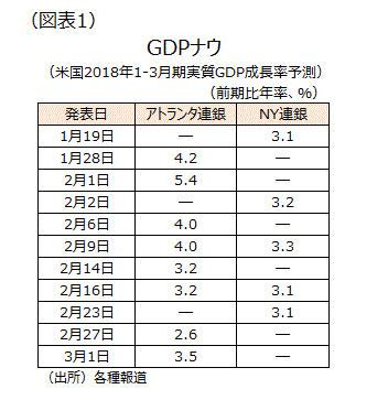 米国の実質GDP前期比年率は17年4~6月期+3.1%、7~9月期+3.2%、10~12月期+2.5%と好調だった。18年1~3月期の「GDPナウ」はNY連銀(2月23日発表)が+3.1%、アトランタ連銀(3月1日発表)が+3.5%となっており(図表1)、米国では1~3月期もしっかりした経済成長が続いているようだ。