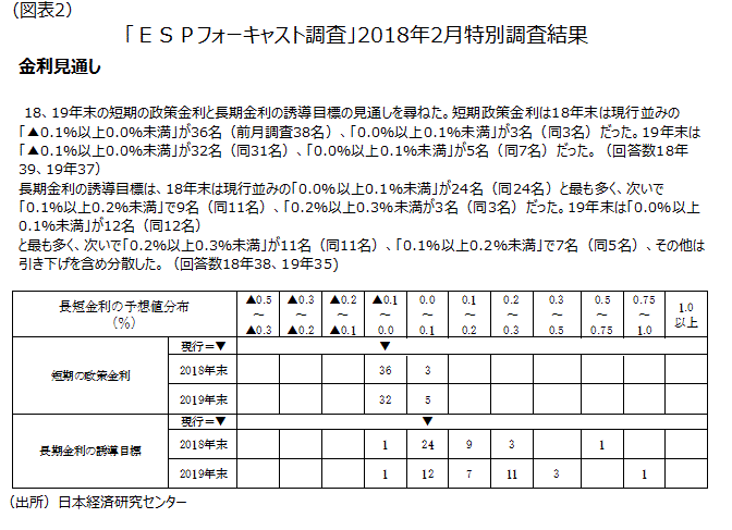 市場ではいろいろな思惑が出ているが、パウエルFRB議長発言などからみて、FRBは今年予定通り年3回の利上げを淡々と実施する可能性が大きいのだろう。日銀の金融政策は変わらないというのが大勢の見方である。しかし、「ESPフォーキャスト調査」ではあるエコノミストが18年末の長期金利の誘導目標を+0.5%とみていることが注目される(図表2)。こうした見方が海外で認識されると、日米金利差からみて本来円安・ドル高方向に動くはずのドル円レートが不思議な動きをし、それが日本の景気にマイナスの影響を及ぼしかねない。
