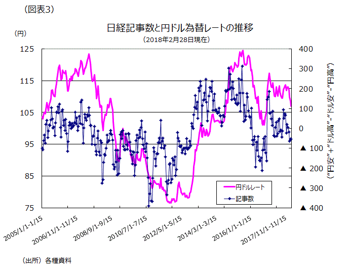 一方、足もと12月調査の日銀短観の想定レート(17年度下期で1ドル=109円66銭)を上回る円高になっていることで、「円高」による企業収益悪化が懸念されるようになったのであろう。しかし、18年1月時点の内閣府の調査では、輸出を行っている上場企業の採算円レートは1ドル=100円60銭で、現在の水準は利益の出る水準である(中堅・中小企業の採算円レートは1ドル=106円40銭)。また、実際のドル安レートに若干先行する半月ごとの日経新聞の「円安の記事数―円高の記事数」でも最近は円高超ではあるものの、その差の幅は落ち着いた動きになっている(図表3)、今後の大幅な円高は予想されにくいとみられる。