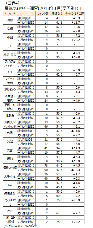 1月の景気ウォッチャー調査現状判断DIは、景気判断の分岐点の49.9と僅かに50%割れとなった。景気ウォッチャー調査公表日の終値による日経平均株価模擬売買では、12月から1ポイント以上低下したので、17年7月10日の20,080円の「買いサイン」に次ぐ「売りサイン」が21,890円の水準で出た。日経平均が3月1日には21カ月ぶりに月初で下落となり、21,724円で引けた。1日時点でも160円強の含み差があったが、2日はNYダウの下落を受け大幅下落し、含み益が膨らんだ。キーワード分析で要因ごとに1月調査の関連DIを作ってみると、17年1月時点で多かった「不安」が今年は減少した。これは正月三が日に初詣の人出が17年は増加したのに対し、18年は概ね横這いだった現象にも既に表れていた。