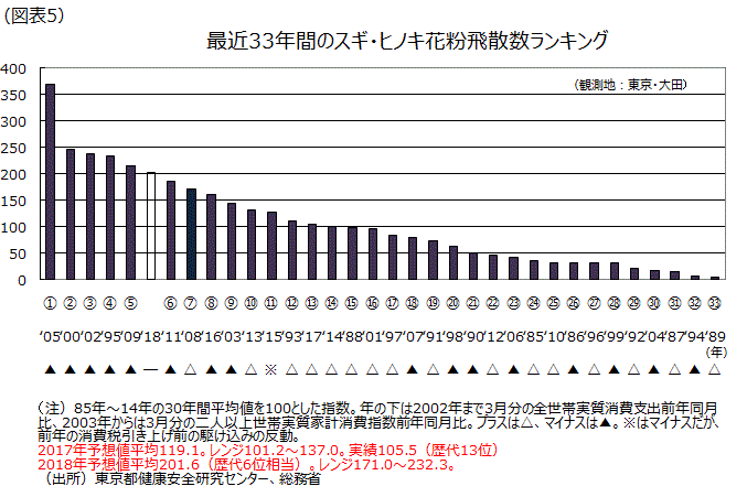 スギ・ヒノキ花粉がほどほどに多く飛ぶと消費にはプラスに働くようだが、あまりに多く花粉が飛んだ年は外出を避けるため消費にマイナスだ。1995年・2000年・02年・05年・09年・11年のような多い年は3月分実質家計消費指数の前年比はマイナスだ。東京都健康安全研究センターのデータから85年~14年の30年間平均値を100とした指数を算出し、東京・大田の17年の花粉飛散数実績をみると105.5で歴代13位だ。消費にはプラスに働いた。18年予想値平均は歴代6位相当の201.6と多い見込みで消費の悪材料になりそうだ(図表5)。