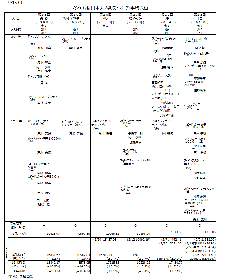 2月の明るい話題は平昌オリンピックで「金」4、「銀」5、「銅」4と合計13個の冬季大会でこれまで最高だった長野オリンピックの合計10個を上回るメダルをとったことだろう。開会式直前の2月9日の日銀平均株価の終値は21,382円62銭で、閉会式が終わった翌日の2月26日の終値は22,183円63銭で約770円上昇した。特に羽生結弦選手と小平奈緒選手が「金」をとった直後の2月19日は前日比428円96銭高と、1月4日に次ぐ今年2番目の上昇幅を記録した(図表6)。羽生結弦選手は昨年11月に右足首を痛めて一時は平昌オリンピック出場が危ぶまれながらも、66年ぶりとなるフィギュアスケート男子2大会連続金メダルを達成した。羽生選手が所属するANAホールディングスの株価は、2月19日に今年最大の上げ幅である92円高を記録した。なお、羽生結弦選手は17年の読売新聞社の「スポーツに関する全国世論調査」好きなスポーツ選手ランキングで、テニスの錦織圭選手、野球の大谷翔平選手に次ぐ第3位になっている。