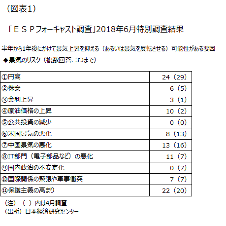 (景気腰折れ材料。第1位「円高」、第2位「保護主義の高まり」)