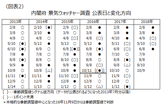 但し、22,000円割れは「景気ウォッチャー調査公表日の終値による日経平均株価模擬売買」のシグナルに沿った動きなので、驚くには値しないと思われる。景気ウォッチャー調査の現状判断DIは2月8日発表の1月分で49.9と12月分より4ポイント下落した。1ポイント以上の変化でそれまでの上昇・下落の流れが変わった時に売買のシグナルが点灯する。2月8日の終値で「売りシグナル」が点いた。その後、現状判断DIは2月分48.6を底に3月分48.9、4月分49.0と緩やかながら上昇したが、1ポイントには届かなかった。5月分では47.1と16年9月以来の水準に低下した。「買いシグナル」は6月時点で点灯していない(図表2)。現状判断DIが前の月を1ポイント以上上回るしっかりした上昇になるまでは、日経平均株価は、何らかのショックがあると、もたついた動きになりやすい傾向があると言える。
