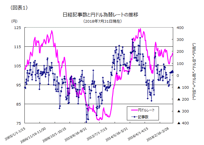 ドル円レートの先行指標である日本経済新聞の「円安の記事数―円高の記事数」はこのところ若干円安に関する記事が多い状態が続いており、先行きも現在の落ち着いた状態が継続しそうだ(図表1)。