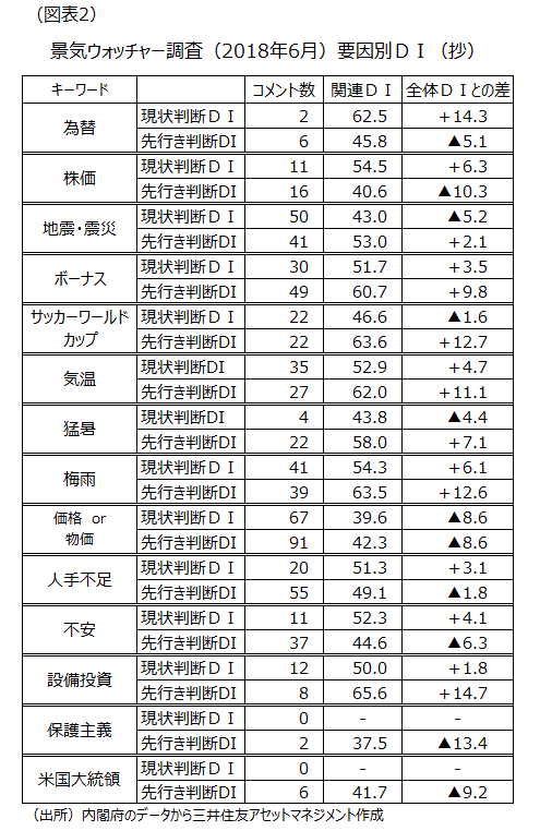 6月の「景気ウォッチャー調査」で景況判断は5月から幾分改善した。どういった要因が作用したが、キーワードごとに関連DIを作成する形で分析してみた(図表2)。