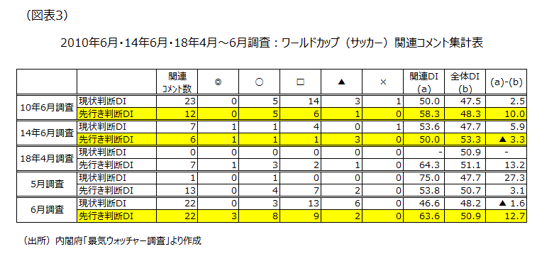 また、「ボーナス」関連の先行き判断DIは60.7、経団連が8月1日発表した18年夏賞与の最終集計結果で大手企業の平均妥結額は前年比+8.62%の増加で95万3,905円、59年の調査期以来で最高となったことなどと整合的だ。サッカーワールドカップロシア大会で日本代表が事前の予想以上に健闘しベスト16に入ったことで、「ワールドカップ」関連DIも10年の南アフリカ大会よりも先行き判断DIの数値もコメント数も良くなった(図表3)。