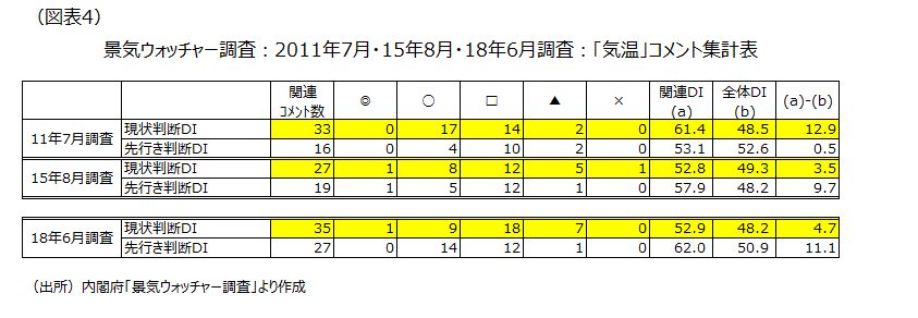 過去の猛暑である2つのケースを分析してみる。第1に2011年7月。7月中旬の関東甲信地方の平均気温が過去2番目に高かった時で、平年を3.1℃上回った。ちなみに同地域・同期間で最も高かったのは、平年を4.1℃上回った今年である。第2は2015年8月。東京都心で観測史上最長となる8日連続の猛暑日を記録した時だ。ちなみに今年の東京都心の猛暑日は7月22日から24日の3日連続が8月2日時点で最長である。「気温」関連・現状判断DIは11年7月の場合は61.4で、15年8月は52.8と、どちらも景気判断の分岐点の50を上回る良好な数字であった(図表4)。