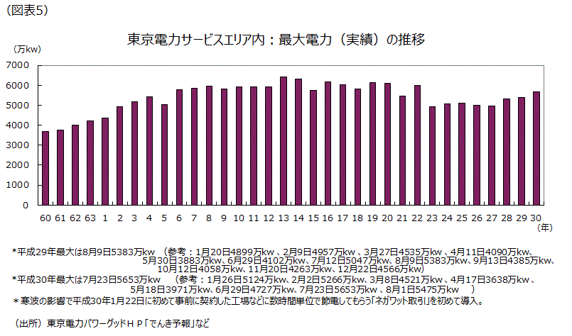 なお、今年7月23日の東京電力管内の最大電力は5,653万Kwであった。これは東日本大震災が発生した11年以降で最大である(図表5)。当時と違い節電の呼び掛けはあまり聞かれず、景気の制約要因にはなっていない。暑さ対策として、自由にエアコンなどを使えるという環境にあるということは、景気にとってはプラスと考えられよう。