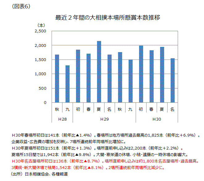 名古屋場所は当初1,800本程度の申し込みがあり、前年の1,677本を上回る見込みだったが、3横綱1大関の休場の影響から前年比▲8.1%の1,542本にとどまった。これで夏場所に続き2場所連続前年比マイナスとなってしまい、もたついた状態が続いている。