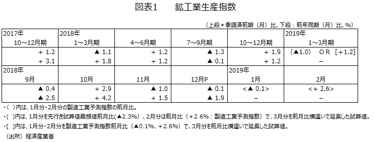 18年12月分の景気動向指数・一致CIに採用されている生産関連や商業販売に関する指標は11月分に比べ、一部を除いて弱含んだ。例えば、鉱工業生産指数は事前の市場予想を上回ったといっても、前月比▲0.1%と2カ月連続して落ち込んだ(図表1)。また、商業販売額(小売業)(前年同月比)、商業販売額(卸売業)(前年同月比)とも鈍化した。このため12月分の一致CIの前月差は▲0.6程度の下降が予測される状況だ。