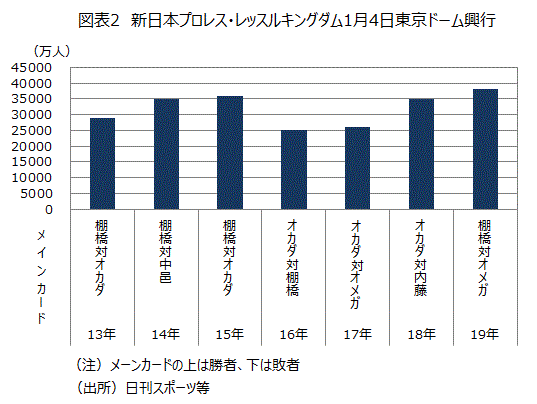 1月4日には日本最大のプロレス団体である新日本プロレスが行う一年で最大の興行東京ドーム大会が開催された。平日金曜日にもかかわらず38,162人という現在の景気拡大局面で最大の観客数を集めた(図表2)。メインイベントのIWGPヘビー級選手権で、ケニー・オメガを破り新日本プロレスの正統派エースの一人と言える棚橋弘至がタイトルを約4年ぶりに奪回したことも、景気が芳しくない時には邪道のチャンピオンが求められることが多いことから考えると明るい材料と言える。