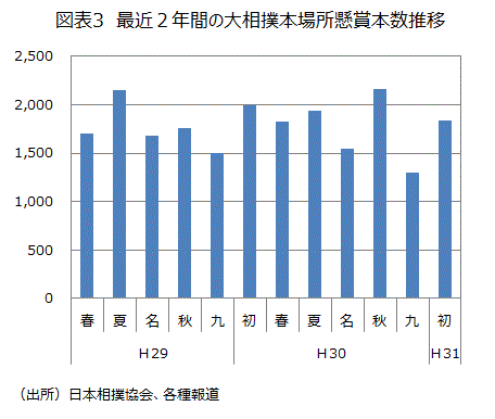 大相撲初場所の懸賞は1,843本で前年比7.5%減であった。昨年秋場所に史上最高の2160本を記録したものの、九州場所は前年比減少、初場所も続いて減少と一見企業の広告費に異変が生じたようにもみられるが、初場所の事前の申し込み段階では2,127本と、前年比+6.7%の増加であった。(図表3)