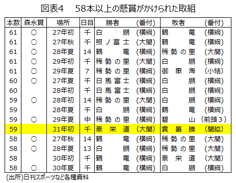 初日の結び、横綱稀勢の里と小結御嶽海の取組みには55本の懸賞がかかった。その日本出身横綱の稀勢の里の引退が大きかった。平成戦後の天覧相撲となった中日結びの一番となった横綱白鵬と碧山の取組にかかった懸賞は40本にとどまった。人気のあった横綱の引退が響いたとみられる。初場所は15日間満員札止めであった。千秋楽はファン投票で決める森永賞こそ初優勝した関脇・玉鷲の取組にかかったものの、結びの大関・豪栄道と関脇・貴景勝との取組には59本という多くの懸賞がかかった(図表4)。基調はしっかりしていても特殊要因で弱含んでしまう足もとの景気に反映しているようだ。