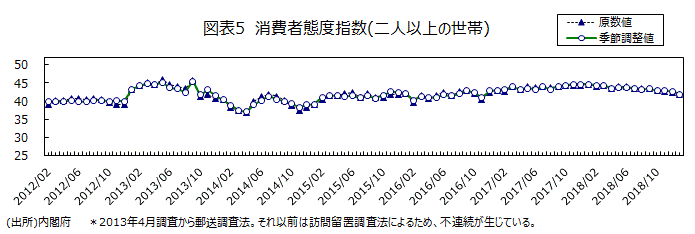 (気懸りな消費マインドの昨秋以降の弱含み、消費者態度指数(二人以上の世帯・季節調整値)は低下基調)