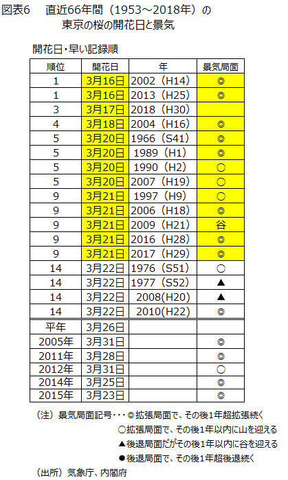 ウェザーニュースが発表した今年の東京の(靖国神社)桜の開花予想(第1回)は3月18日になった。18年の3月17日より1日早いが、平年の3月26日より大幅に早い予想だ。1953年から実施されている気象庁の生物観測調査で、東京の桜の開花が3月21日以前と早い時は13回あり景気は拡張局面である。早く春が来ると春物も売れるし、お花見で人々の気分が高揚しよう。