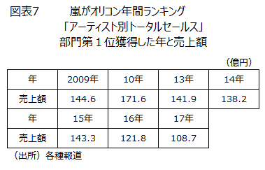 ファンクラブ会員のチケット代は9,000円で計算して237.5万人分は213.8億円になる。これに関連グッズやファンの移動の交通費、宿泊費を考慮すると、20周年記念ツアーで相当の金額が動くことになる。おそらく20年にはこのDVD等が出るだろう。10周年の翌年10年のオリコン年間ランキング「アーティスト別トータルセールス」で「嵐」は売上総額171.6億円で第1位に輝いた(図表7)。この自身最高額を20周年の翌年の20年には更新しそうだ。