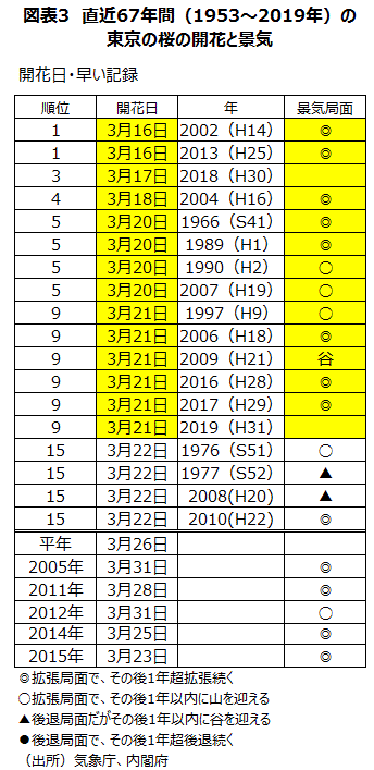 今年の東京(靖国神社)の桜の開花は3月21日になった(図表3)。18年の3月17日より4日遅いが、平年の3月26日より5日早かった。1953年から実施されている気象庁の生物観測調査で、東京の桜の開花が3月21日以前と早い時は13回あり、景気は後退局面にはなったことがない。早く春が来ると春物も売れるし、お花見で人々の気分が高揚しよう。東京の満開は3月27日で開花から6日目と早かったがその直後気温が低くなったので、満開状態が長持ちをしたかたちとなった。開花から満開までの期間が長いと、景気の持続性が高まる傾向にあるが、今年も実質的に桜が長持ちをしたことで、人々の気持ちを明るくしたと思われる。(東京(靖国神社)の桜の開花は3月21日、過去は全て景気後退局面にはなっていない)