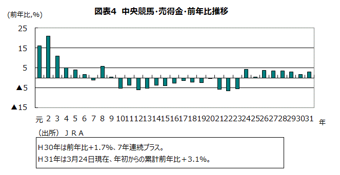JRA中央競馬の売上高(売得金)の年初からの累計前年比は、3月24日までで3.1%増と堅調である(図表4)。8年連続の増加に向けて好調なスタートを切っている。