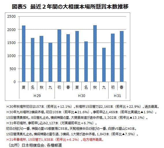 (大相撲の春場所の懸賞本数は1,938本、地方場所で過去最高更新。前年同場所比は3場所ぶりのプラス)