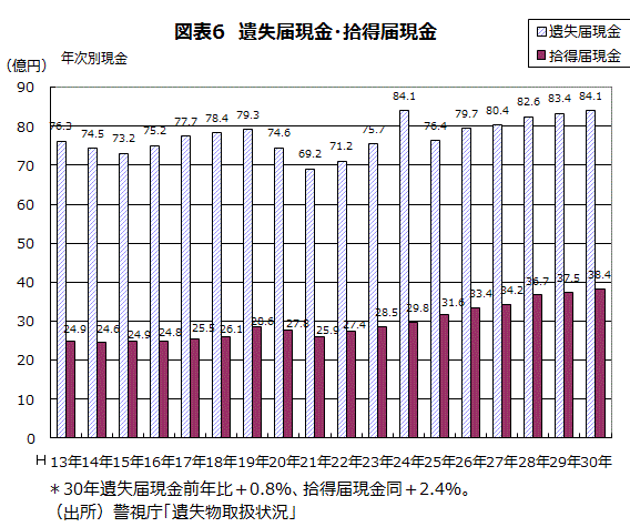 (警視庁調べ遺失届得現金に対する拾得届現金の比率は13年に40%台に乗りその後上昇、18年は45.7%)