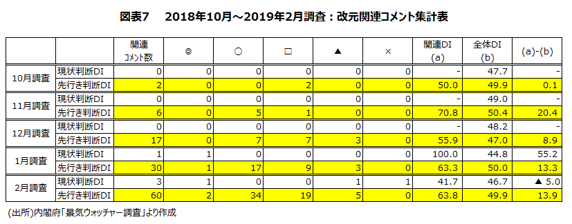 「景気ウォッチャー調査」では、先行き判断で「改元」にふれたウォッチャーが10月の2人に対し、11月6人、12月17人、1月30人、2月は60人と増えている。改元関連DIを作ると10月は景況判断の分岐点と同じ50.0と中立だったが、11月70.8、12月55.9、1月63.3、2月は63.8で50を上回っている(図表7)。