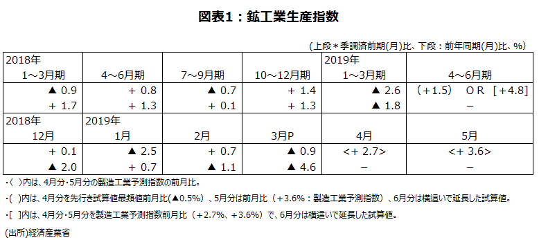 4月26日に公表された平成最後の鉱工業生産指数である3月分速報値は芳しくない内容になってしまった。前月比は▲0.9%とマイナスに転じた(図表1)。3月末に公表された製造工業生産予測指数の前月比+1.3%、経済産業省の先行き試算値の同+0.4%とは逆符号となり、先行き試算値の90%の確率に収まる範囲の下限値▲0.6%を下回った。