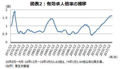 19年3月分の有効求人倍率が1.63倍と74年1月分の1.64倍以来の高水準にある(図表2)ことに代表されるように、雇用・所得関連のデータが依然しっかりしており、内需の底堅さが感じられる経済指標も多い中で条件を満たすかどうか、予断をもつことなく見守りたい局面だ。
