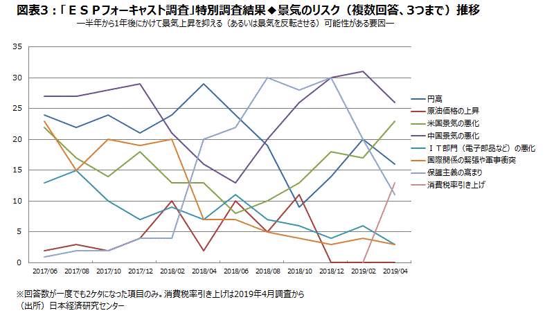 製造業中心に景気が弱含みとなっている主因である中国の景気に足もと変化がみられる。ESPフォーキャスト調査が17年6月から偶数月に実施している景気のリスク要因に関する特別調査では、直近の19年4月調査で第1位は3回連続して「中国景気の悪化」となったが、回答数は2月調査から5減って26となった(図表3)。ESPフォーキャスト調査19年2月調査での中国製造業PMI見通しが年央以降回復する予測であることと併せて考えると、政策効果による年央以降の中国景気の持ち直しが期待されている局面だ。