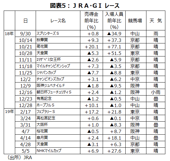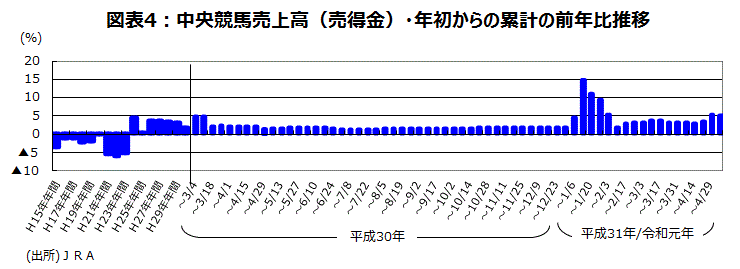 JRA中央競馬の売得金5月5日現在の年初からの累計前年比は+4.9%の増加で、8年連続プラスに向け順調に推移している(図表4)。令和に入って最初のG1レースであるNHKマイルカップの売得金は前年比+6.9%だった(図表5)。