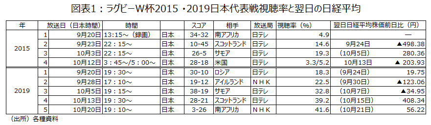 史上初の決勝トーナメント進出を果たしたラグビーワールドカップでの日本代表の活躍は、日本に感動と勇気を与えてくれた明るい話題になった。日本はロシア、アイルランド、サモア、スコットランドに4連勝し、全勝で予選リーグを1位通過し、初の決勝トーナメント進出を果たした。スコットランド戦の平均視聴率(ビデオリサーチ、関東地区)は39.2%、瞬間視聴率は53.7%と盛り上がりがみられた(図表1)。裏番組となった大河ドラマ「いだてん」の平均視聴率は3.7%と史上最低を更新してしまった。ラグビーは野球やサッカーに比べてマイナー競技の印象が強かったが、開幕後はがぜん盛り上がりを見せた。また、前回2015年の大会では、南アフリカを破り予選リーグ3勝1敗でも決勝トーナメント進出を逃していたので悲願の決勝トーナメント進出に日本中が沸いた。「1次リーグ日本戦4試合」は全国で5,486万人が見たとビデオリサーチは「テレビ視聴率調査」から全国の視聴人数を推計している。