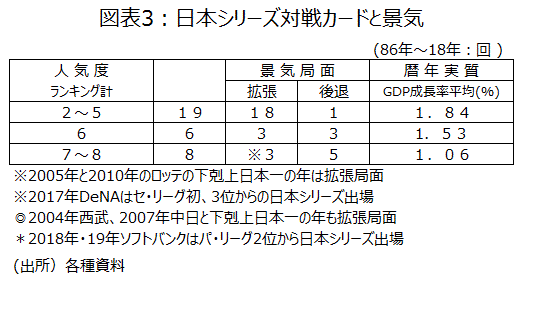 なる(図表3)。一部に景気後退説も出ているが、対戦カードからみるとSMBC日本シリーズの期間は、景気の拡張局面である可能性が大きいと思われる。