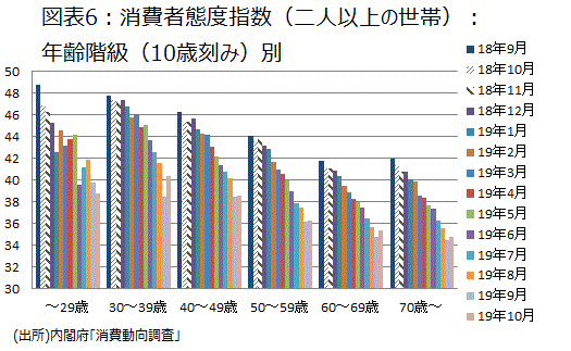 なお、消費税増税1年前となった18年10月から1年間にわたって低下を続けていた内閣府「消費動向調査」の消費者態度指数(二人以上世帯、季節調整値)は、19年10月分が前月より0.6ポイント高い36.2になり、1年ぶりに上昇に転じたことは明るいデータだ。実際に消費税率が引き上げられると先行きの見通しは改善方向に向くことが多い。高齢者のマインド悪化も一服した感がある(図表6)。
