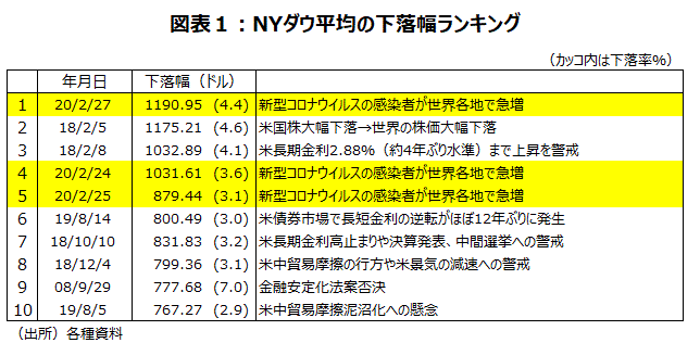 2月最終週にニューヨーク株式市場のNYダウをはじめ、世界の株式市場は大きく下げた。新型コロナウイルスの感染がイタリアや韓国、イランなど中国以外でも広がり、終息時期が見えなくなってきたことが懸念されたからだ。NYダウは、2月27日に過去最大の下落幅となる前日比1,190.95ドル安を記録した(図表1)。24日には史上4番目の下落幅である1,031.61ドル安、25日には史上5番目の下落幅である879.44ドル安をつけた。ただ、2月27日の下落率は4.4%にとどまった。過去最大の下落率は、1987年10月19日のブラックマンデーで、このときは22.6%だった。一方、3月2日にNYダウは前週末比1,293.96ドル高の上昇幅となった。上昇幅は過去最大だ。新型コロナウイルスの感染拡大で動揺する金融市場を安定化させるため、世界の主要中央銀行が協調して金融緩和に動くとの観測が広がったことが背景である。今後の注目点は、中国の生産活動の月内回復を確認できるか、また新型コロナウイルスの新規感染者の発生ペースが落ち着くかという点だろう。