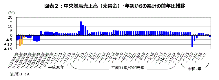 昨年まで8年連続前年比増加となった中央競馬の売得金は2月9日までの累計前年比で+2.3%の増加となっていたが、新型コロナウイルスの感染拡大の影響で2月23日までの累計前年比で+0.4%に鈍化した。初の無観客競馬となった2月29日、3月1日は電話・ネット発売のみとなり、3月1日までの売得金累計前年比は▲1.4%と減少に転じた(図表2)。