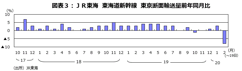 JR東海によると、1月の東海道新幹線の輸送量は前年比+3%の増加と堅調だったが、2月は19日時点の東海道新幹線の輸送量は前年比8%減。国内旅行のキャンセルや出張自粛の広がりを勘案すると、2月の前年比下落率はさらに拡大しそうだ(図表3)。