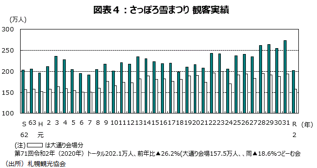 今年で 71回目を迎えた「さっぽろ雪まつり」は、厳しい環境下の開催になった。記録的な少雪による雪不足にも見舞われ、雪まつりに使う雪もかなり遠方からの輸送が必要な状態だった。さらに、新型コロナウイルスが大きく影響した。中国からの観光客が大幅に減少しただけでなく、新型コロナウイルスの感染を心配した地元の小学校や幼稚園が団体来場を取りやめたようだ。開催期間中の来場者数は202.1万人で、過去最高だった昨年の273.7万人に比べ▲26.2%減少した。内訳をみると、大通会場の来場者数は157.5万人、前年比▲18.6%だったが、つどーむ会場が44.6万人、前年比▲44.5%と大幅に減少した。リーマンショックの翌年2009年の208.0万人、東日本大震災の翌年2012年の205.4万人を下回る数字だ。人数比較が長年にわたり可能な大通会場分で比べると、阪神淡路大震災の直後で自粛ムードが大きかった1995年150.4万人以来25年ぶりの少ない来場者数となった(図表4)。