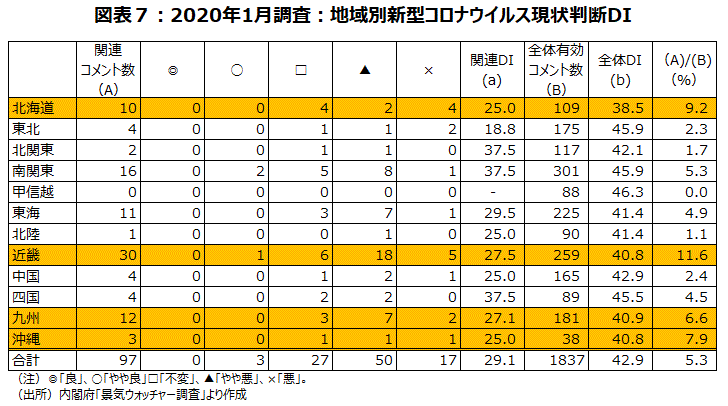 「新型コロナウイルス」関連判断DIを作成してみると、分岐点の50を下回り、現状判断DIが29.1、先行き判断DIが29.9となった。全員が「やや悪くなっている」とコメントすると、25.0なので、それに近い数字であると言えるだろう。現状判断で新型コロナウイルスに言及した人の割合は、全国平均で5.3%だったが、これを上回った地域は、近畿11.6%、北海道9.2%、沖縄7.9%、九州6.6%の4地域で、いずれも中国人観光客のインバウンド需要が大きい地域だ(図表7)。