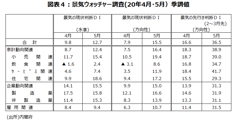 景気に敏感な立場にいる人々の肌感覚を聞く5月の「景気ウォッチャー調査」で、現状判断DI(季節調整値)が前月から7.6ポイント上昇の15.5と、統計開始以来最低となった4月から回復している。なかでも飲食関連の現状判断DIと現状水準判断DIは、4月に統計史上初のマイナスという前代未聞の数値が出たが、こちらもプラスに転じた。 また、2~3か月先の景気の先行きに対する「先行き判断DI(季節調整値)」は前月を19.9ポイント上回る36.5と回復が顕著だ(図表4)。緊急事態宣言が全国的に解除された5月25日から調査期間が始まっていることもあり、景況感の回復に期待する声が多かった。現在の景気の水準自体に対する判断では、ほとんどの指標が3月の水準さえ回復しておらず極めて厳しい状況が続いてはいるものの、先行き判断を含めて考えると最悪期は脱したとみられる。内閣府の5月調査の基調判断は「極めて厳しい状況にあるものの、悪化に歯止めがかかりつつある」に上方修正された。