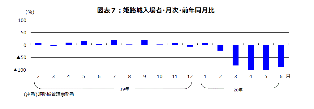 新型コロナウイルス感染症の影響で、5月分の訪日外客数は1,700人と史上最低となった。前年同月比は▲99.9%である。インバウンド消費が減少し5月分の外国人観光客百貨店売上高・前年同月比は▲97.5%だった。5月分の観光地の人出は激減した。休園していた金沢兼六園や函館五稜郭タワー入場者はゼロ人で前年同月比▲100%だった。6月分では金沢兼六園の入場者は前年同月比▲87.5%、函館五稜郭タワー入場者は前年同月比▲93.6%とまだまだ厳しい状況ながら幾分マイナス幅が縮小した。姫路城は5月28日から敷地内入場を再開、6月15日から天守閣入場再開したという。5月分の入場者は前年同月比が▲99.3%だったが、6月分では▲86.0%になった(図表7)。