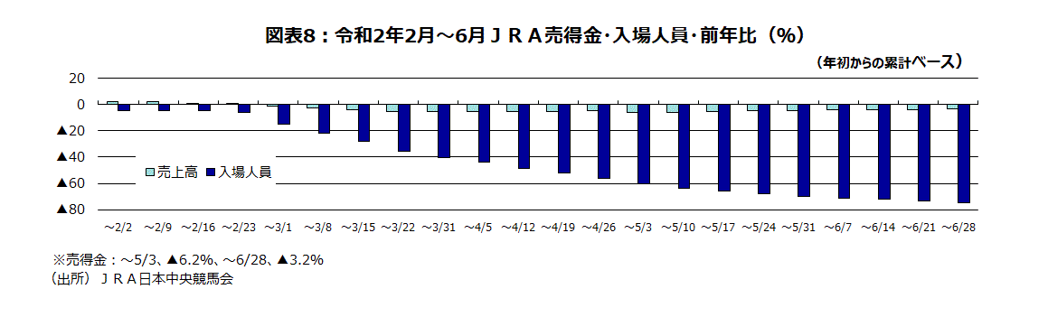 JRA(中央競馬会)の今年の売得金・年初からの累計金額の前年比は2月23日まではプラスの伸び率だった。マイナスに転じたのは2月29日から無観客レースとなった3月1日までの週である。そこから入場者は週を追うごとにマイナス幅を拡大し、6月28日の週の累計で前年比▲74.4%になった。一方、売得金はネット(ごく一部が電話)でしか馬券が購入できなくなったため、当初は減少傾向で5月3日の週までの累計で▲6.2%まで悪化した。しかし、そこから改善し、6月28日までの週の累計では前年比▲3.2%まで戻した(図表8)。
