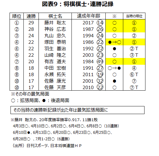 将棋の世界では17歳の藤井聡太七段の活躍が、ファンならずとも多くの人々を勇気づける話題だ。5番勝負の棋聖戦では、史上最年少でタイトルに挑戦し、初戦・第2戦と白星を重ねタイトル獲得に王手となっている。また、7番勝負の王位戦も初戦白星スタートだ。将棋の棋士が連勝記録を更新した時は、景気の拡張局面に当たっている(図表9)。人々が明るい話題に飢えている中で、期待に応えて史上最年少でのタイトル獲得が実現すれば、景気にもプラスの影響が期待できるだろう。