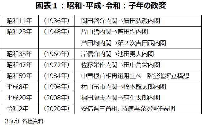 昭和以降、子年には政変が起こるというジンクスが存在する(図表1)。ほとんどの年で政権交代が起こり、政権交代が起こらなかった1984年には、未遂に終わったが、二階堂擁立構想という、自由民主党総裁任期満了に伴う中曽根康弘首相の再選を阻止するため、鈴木善幸前首相・福田赳夫元首相らが、野党も巻き込んで木曜クラブ(田中派)の二階堂進自由民主党副総裁を擁立しようとした政変が発生している。安倍晋三自民党総裁の任期が2021年9月なので2020年の子年は無風かと思われたが、昭和、平成と続く子年政変のジンクスは令和になっても生きていた。