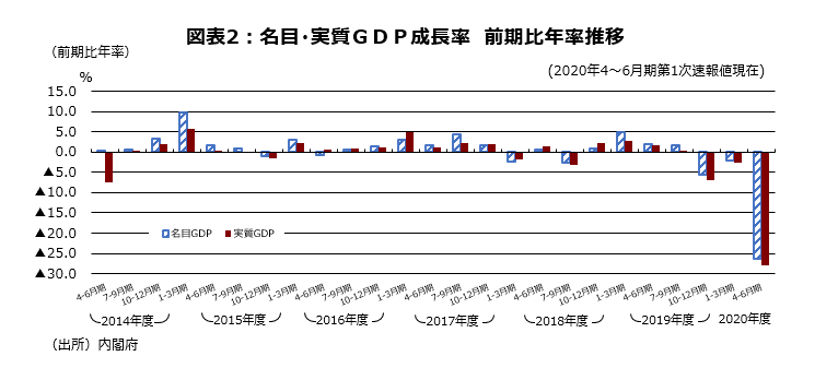 20年4~6月期実質GDP成長率・第1次速報値は前期比▲7.8%、前期比年率▲27.8%となった(図表2)。リーマンショック後の09年1~3月期の前期比年率▲17.8%を上回る減少率で、平成23年基準の現行統計で遡れる1980年4~6月期以降で最大の落ち込みである。 4~6月期では、新型コロナウイルスの感染拡大で4月・5月に緊急事態宣言が発動され、経済活動が停滞した。内需の前期比寄与度は▲4.8%、外需の前期比寄与度は▲1.9%だった。なお、4~6月期名目GDP成長率・第1次速報値は前期比▲7.4%、前期比年率▲26.4%となった。季節調整値は506.6兆円で直近のピークだった19年7~9月期も557.8兆円から51兆円低い水準になった。9月8日発表の4~6月期実質GDP成長率・第2次速報値は、法人企業統計の設備投資が弱かったため、下方修正されそうだ。
