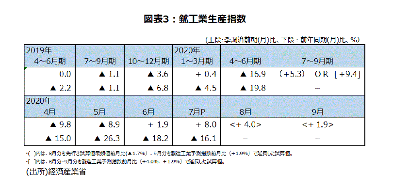 7月分鉱工業生産指数・速報値は、前月比+8.0%と2カ月連続の上昇となった。緊急事態宣言下の4月・5月と、感染拡大防止のための工場の稼働の低下、操業停止などで結果として大幅な生産調整が行われた。宣言が解除された鉱工業生産指数は6月分で前月比+1.9%とプラスに転じた。鉱工業生産指数の先行きを製造工業予測指数でみると8月分は前月比+4.0%の上昇、9月分は前月比+1.9%の上昇の見込みである。順調にいけば、景気一致指標として重要な鉱工業生産指数は4カ月連続の上昇が見込まれる(図表3)。(但し、過去のパターン等で製造工業予測指数を修正した経済産業省の機械的な補正値でみると、8月分の前月比は先行き試算値最頻値で▲1.7%の下降になる見込みであり、8月分の鉱工業生産指数の動向は要注目だ。)