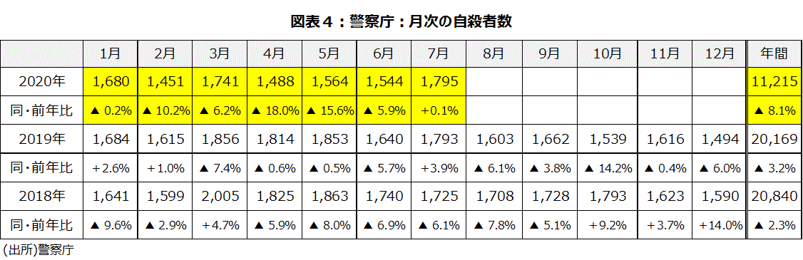 完全失業率は5月分で2.9%(2.88%)、直近ボトムの19年12月の2.2%(2.19%)から5カ月連続して上昇した。6月分は2.8%(2.83%)と若干鈍化したが、7月分で2.9%(2.86%)と再び上昇した。しかし、依然2%台はキープしている。完全失業率と関連が深い警察庁「自殺統計」の自殺者数は、7月分で1,795人、前年比+0.1%と微妙な伸び率になった。但し、年初からの累計は11,215人、前年比▲8.1%である(図表4)。また、1~7月分の刑法犯総数は前年同月比▲17.1%、7月分は同▲15.4%と減少している。現在、雇用悪化、自殺者の増加といった事態を回避するための雇用調整助成金の拡充などの政策がある程度は効いているとみられる。