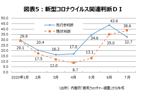 景気に敏感な立場にいる人々の意見を聞く「景気ウォッチャー調査」は4月に各判断DIが統計開始以来の最低を記録した。現状判断DIは7.9だった。その後、5月15.5、6月38.8、7月41.1と、全員が「変わらない」と答えた場合の50を下回っているものの、持ち直しの動きがみられる。また、2~3カ月先の景気の先行きに関する先行き判断DIは4月の16.6から6月では44.0まで戻していたものの、新型コロナウイルスに対する懸念が強まっているために7月は36.0に低下した。但し、全員が「やや悪化」と答えた場合の25を上回っている。