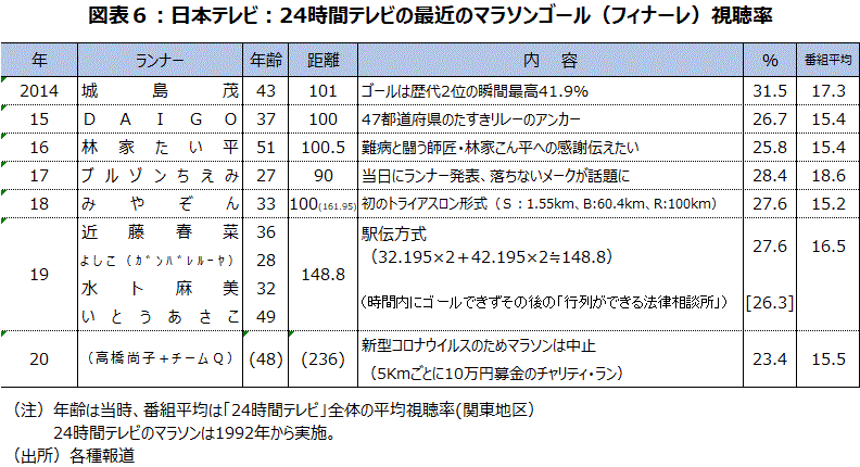 シドニー五輪女子マラソン金メダリスト高橋尚子さんが持ち込んだ新企画「募金ラン」が日本テレビ系「24時間テレビ43」で行われた。同番組では今年、新型コロナウイルス感染拡大防止の観点から公道を使ったチャリティーマラソンを中止した。“新しい日常での1回目”の24時間テレビで、この企画は、恒例のチャリティーマラソンに代わる形で実施された(図表6)。 高橋さんの他に、女優土屋太鳳さんや、アテネ五輪女子マラソン金メダリストの野口みずきさんら5人の「チームQ」が走った。募金ランは感染防止などに配慮し、私有地にある5キロのコースで実施。1週走るごとにランナーが10万円を募金するルールで行われた。高橋さんは単独で計116㎞、「チームQ」5人は120㎞それとは別にリレー形式で走り、計6人の総走行距離が236㎞、募金総額470万円に達した。マラソンの最終局面で流れる「負けないで」「Tomorrow」などの応援歌は今年も流れた。これらの曲は、景気が芳しくない局面で発売され曲のヒットとともに景気が回復したという実績がある。チームQメンバーは終了後、日本テレビ系の「行列のできる法律相談所」に生出演し、女子レスリング五輪3連覇の吉田沙保里さんが「皆さんが頑張ってる姿を見て、私も頑張らないと思った」と話した。「募金ラン」は、厳しい環境下で新たなアイディアを実行することを通して、多くの人々を「動く」ことに前向きにするきっかけになったと思われる。