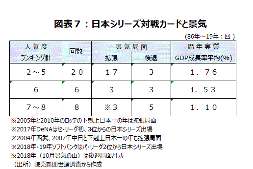 巨人菅野智之投手が、開幕戦から無傷の9連勝。開幕投手の開幕からの連勝記録で、90年の斎藤雅樹の8連勝を30年ぶりに超え、巨人では38年春のスタルヒン(11連勝)以来2人目という快挙を82年ぶりに達成した。また、巨人で開幕9連勝以上は38年春のスタルヒン11連勝、38年秋のスタルヒン10連勝、42年藤本10連勝、66年堀内13連勝に次いで54年ぶり4人、5度目である。今年のペナントレースは8月30日現在、最も人気のある巨人が貯金14と首位を走っているがそのうち9は菅野によるものであり、貢献度は大きい。プレーオフがあるパリーグは人気1位のソフトバンクが首位で人気5位のロッテが2位だ。日本シリーズの対戦カードは優勝チーム同士の対戦になると、人気1位チーム同士の対戦になるので、対戦チームの人気ランキング合計は2と、景気拡張局面17回、後退局面3回というランキング合計2~5のケースになる。また、ロッテが日本シリーズ出場なら下克上のチームが出ると拡張局面というジンクスからみて、どちらも景気面から好ましいだろう(図表7)。